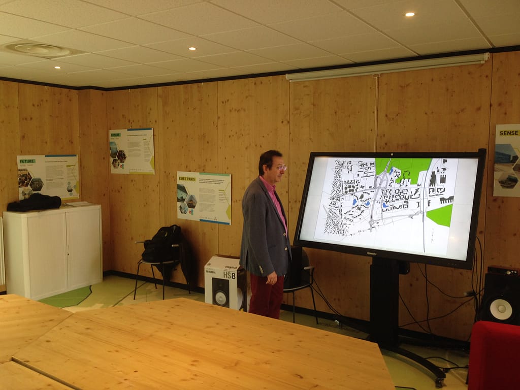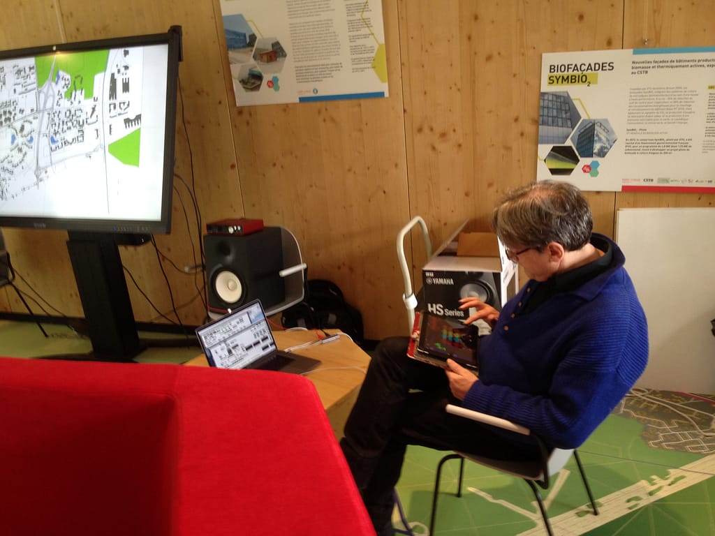 Les curseurs, commandés par les doigts du musicien face à la carte affichée sur l’écran tactile, envoient des informations sur chaque bâtiment (position, forme) à Max, informations qui servent ensuite à piloter des synthétiseurs et des échantillons. Le son est spatialisé en quadriphonie autour du public.
